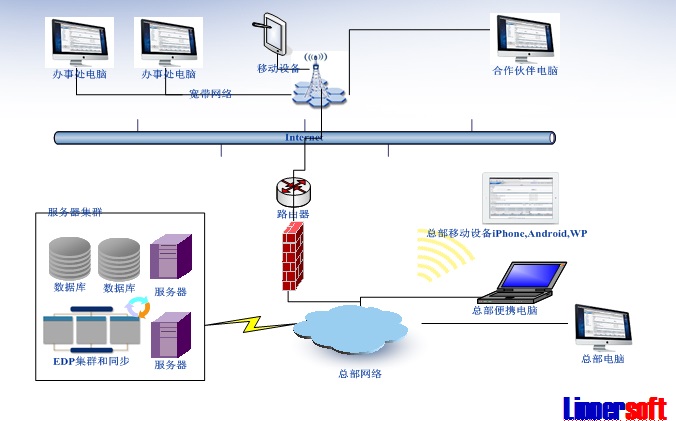 對于大型公司 , EDP 支持 Unix 系統架構的小型機集群部署 , 采用負載均衡技術 ,同時啟用EDP集群和同步技術,保證EDP系統在大組織中運行的苛刻的高可用性(HA), 采用高性能的大型數據庫 (Oracle,DB2), 支持成千上萬個員工同時在任何時間 , 任何地點 , 任何方式訪問本企業管理系統 .