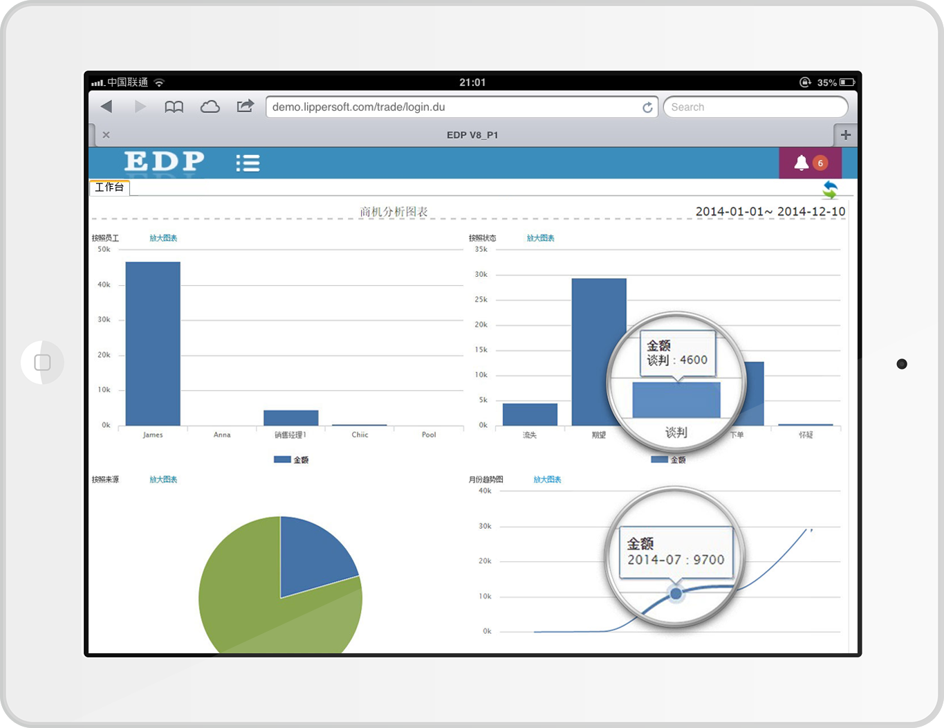 管理者更是可以通過管理駕駛艙從多種緯度,以直觀的數字和圖表方式了解未來一段時間(如三個月)的商業機會,依據業務員,或者是狀態、月趨勢圖了解業績的成交情況,幫助管理者提前預知市場動向,業務人員工作效率,并第一時間及時指導。