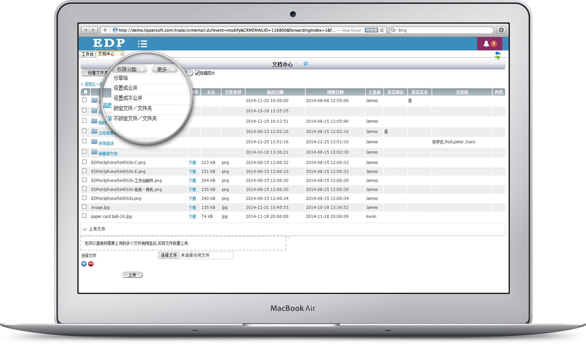 文檔中心可以在公司范圍內安全的共享文件,統一更新文件。就像存放公司內網機器上的文件夾,但是,EDP文檔中心可以隨時隨地在外網訪問,可以通過多種設備讀取和上傳。而且可以嚴格、便捷的控制訪問權限,如是否可看見,是否只讀。