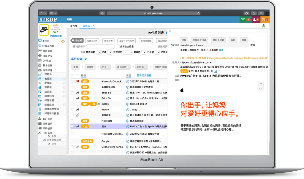 現在隨著智能手機和平板電腦的普及,很多企業的員工,也會使用手機和平板來進行移動辦公。 但是通過內置只適合個人的電子郵件客戶端來管理郵件,就出現了更多新的問題, 員工和管理人員的收件信息分散在不同的設備上面,同時,發件箱不能跨設備同步,也不能有效的自動關聯客戶和歸檔,移動便捷性卻帶來更多管理問題。